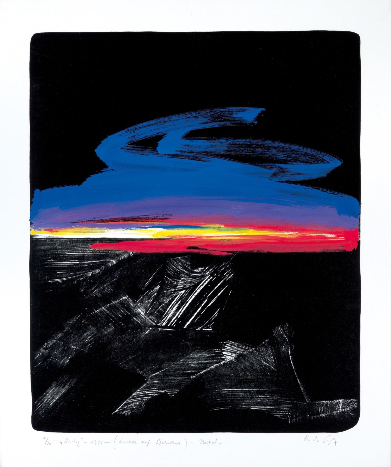 Abgebildet im Werkverzeichnis der Original-Lithographien Band 1, 1946 – 1994, Seite 97, Nr. W094, Manfred Hügelow, Offenbach, 1994.