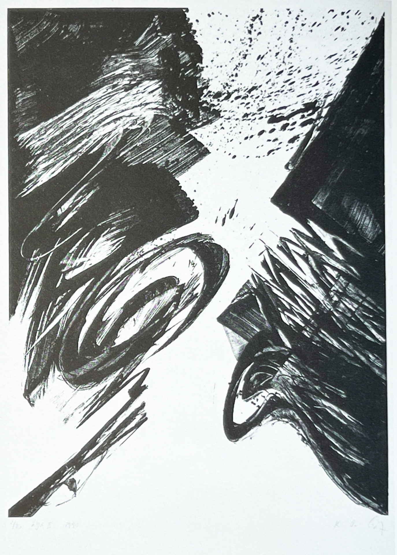 Abgebildet im Werkverzeichnis der Original-Lithographien Band 1, 1946 – 1994, Seite 68 rechts, Nr. W062, Manfred Hügelow, Offenbach, 1994.